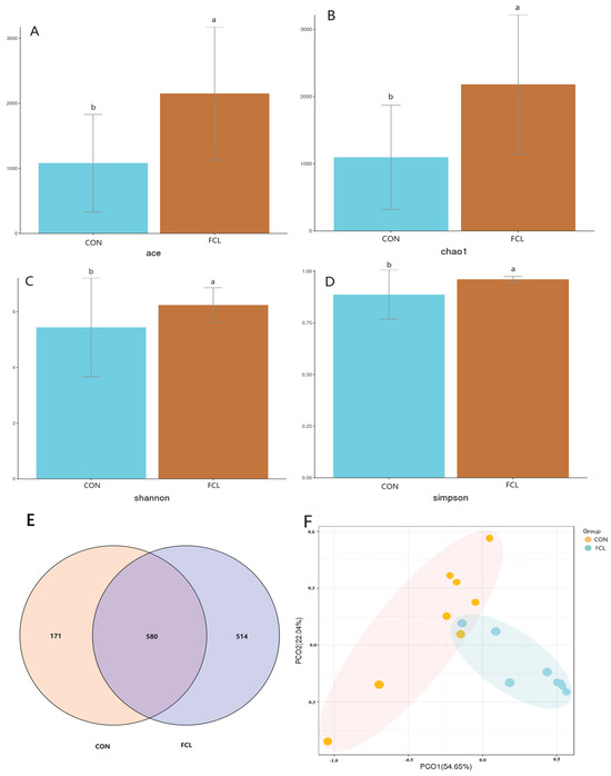 Effects of fermented cassava leaves on alpha and beta diversities in the cecal microbiota of geese. (A) ACE, (B) Chao1, (C) Shannon, and (D) Simpson indices; (E) Venn diagram of cecal microbes identified between FCL and CON geese; (F) PCoA analysis of cecal microbiota. Each bar represents mean ± SD. Different lowercase letters meant significant differences (p < 0.05).