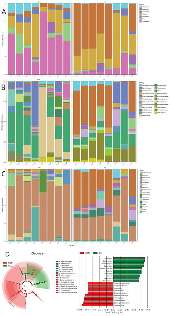 Effects of fermented cassava leaves on cecal microbial communities in geese at the (A) phylum, (B) family, and (C) genus levels; (D) Linear discriminant analysis Effect Size (LEfSe) analysis of cecal microbial communities of the two treatment groups.