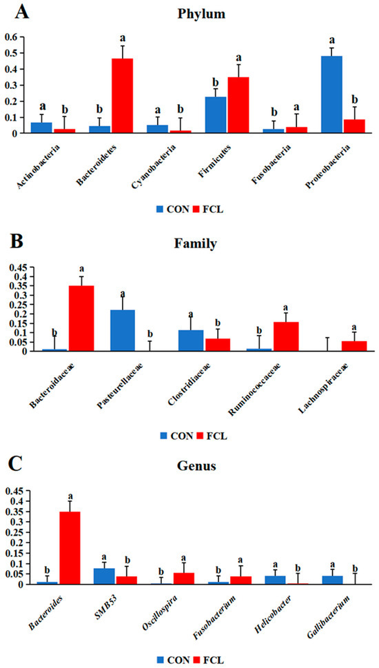 The cecal microbial community structures of geese treated with different diets are shown in Figure 4. In CON geese, the most abundant microbes at the phylum level (Figure 4A) were Proteobacteria (47.92% ± 4.93%), Firmicutes (23.06% ± 5.15%), Actinobacteria (6.93% ± 1.10%), Cyanobacteria (4.93% ± 0.93%), Bacteroidetes (4.8% ± 0.44%), and Fusobacteria (2.63% ± 0.26%). For the FCL group, they were Bacteroidetes (45.09% ± 6.77%), Firmicutes (36.14% ± 4.99%), Proteobacteria (8.88% ± 2.97%), Fusobacteria (3.7% ± 0.87%), and Actinobacteria (2.64% ± 0.7%). The most abundant microbes in the CON group at the family level (Figure 4B) consisted primarily of Pasteurellaceae (21.53% ± 3.12%), Clostridiaceae (11.45% ± 1.19%), Helicobacteraceae (3.68% ± 0.66%), Neisseriaceae (3.48% ± 0.81%), Lactobacillaceae (3.11% ± 0.37%), and Hypomicrobiaceae (2.91% ± 0.62%). The FCL group consisted of Bacteroidaceae (33.60% ± 4.64%), Ruminococcaceae (15.82% ± 4.91%), Clostridiaceae (7.12% ± 1.26%), Lachnospiraceae (5.66% ± 1.34%), Paraprevotellaceae (4.17% ± 0.43%) Fusobacteriaceae (3.70% ± 0.39%), and Desulfovibrio (2.57% ± 0.59%). The main microorganisms identified in the CON group geese at the genus level (Figure 4C) were Gallibacter (4.10% ± 0.62), Helicobacter (3.66% ± 0.18%), Lactobacillus (3.11% ± 0.56%), and Devosia (2.81% ± 0.22%). The FCL group mainly consisted of Bacteroides (33.43% ± 5.71%), Oscillospira (5.48% ± 0.67%), Fusobacterium (3.7% ± 0.84%), and Faecalibacterium (2.93% ± 0.59%). In addition, LEfSe (Linear discriminant analysis Effect Size) was used to identify the most differentially abundant microbes between the CON and FCL groups (Figure 4D). The indicator microorganisms in the FCL group were Bacteroidia and its constitutive taxa (Bacteroidales, Bacteroidaceae, and Bacteroides), Ruminococcaceae, Clostridia (Clostridiales), Oscillospira, and Lachnospiraceae. The microorganisms enriched in the CON group were Proteobacteria (Gammaproteobacteria, Alphaproteobacteria, and Betaproteobacteria), Pasteurellaceae (Pasteurellales), Gallibacterium, Neisseriaceae (Neisseriales), and Campylobacterales.