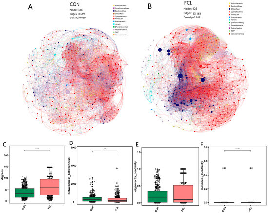 Co-occurrence network analysis of cecal microbial communities of geese treated with different diets. (A) Network of CON; (B) network of FCL; (C) degree; (D) betweenness; (E) eigenvector centrality; (F) closeness centrality. Each bar represents mean ± SD. ** Represents significant difference (p < 0.01); **** represents significant difference (p < 0.0001).