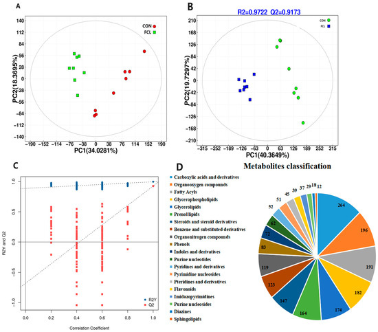 After filtering, the analysis of the cecal metabolome revealed 14,465 high-quality ions and 6526 metabolites. Principal component analysis (PCA) indicated clear differences in the cecal metabolites of geese fed the control diet and the fermented cassava leaf diet (Figure 7A). Partial least squares discriminant analysis (PLS-DA) was used to detect the most discriminating metabolites between the two treatment groups. The values of R2Y and Q2 in the present study were 0.9722 and 0.9173. These high values, both higher than 0.80, illustrated the stability and reliability of the model (Figure 7B). These results indicated that the distributions of cecal metabolites in the FCL group and the CON group differed significantly. To further examine the reliability of the PLS-DA model, we also performed permutation validation testing (Figure 7C). The positive slope of the Q2Y regression line indicated that the model was reliable. Moreover, the R2Y values (blue dots) were observed to be higher than the Q2 values (red dots), indicating independence between the training and testing sets. Of the 6526 metabolites identified in the goose ceca, the most common classes were carboxylic acids and derivatives, organooxygen compounds, fatty acyls, glycerophospholipids, glycerolipids, and prenol lipids (Figure 7D).