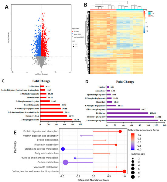 Effects of fermented cassava leaves on cecal metabolites and associated metabolic pathways in geese. (A) Volcano plot analysis of goose cecal metabolites (CON vs. FCL); (B) differential metabolite clustering heatmap; (C) upregulated metabolites with top 10 largest fold change (FC) values; (D) downregulated metabolites with top 10 largest fold change (FC) values; (E) differential abundance score analysis of metabolic pathways enriched among differential metabolites (CON vs. FCL).