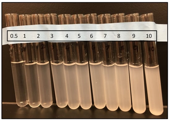 Preparation of McFarland standards. Image showing test tubes containing 1% barium chloride and 1% sulfuric acid that were mixed in proportions as shown in Table 1 to obtain a series of standards from 0.5 to 10. The turbidity of the solution increases from 0.5 to 10 in serial order of the standards. Picture is not to scale.