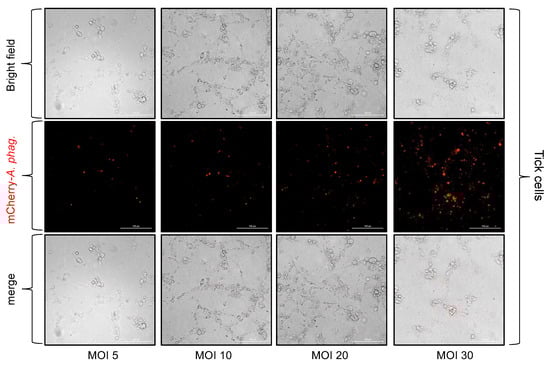 Infection of tick cells with mCherry-A. phagocytophilum at different MOIs determined from the McFarland standard. Phase contrast and fluorescent microscopic images showing mCherry-A. phagocytophilum infection (red staining) at different MOIs (5, 10, 20, and 30) in tick cells. After 24 h p.i., cells were processed for imaging using a fluorescent microscope with 40× objective. The scale bar indicates 100 μm.