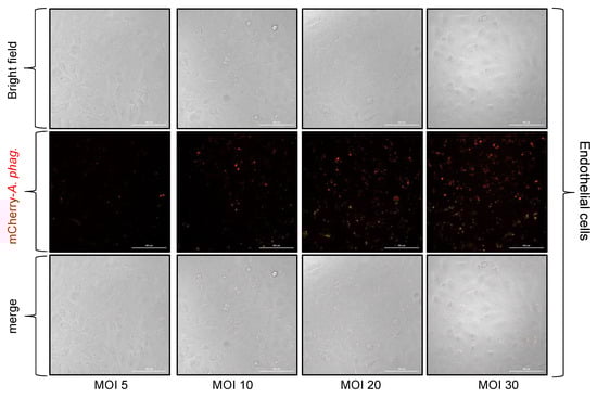 Infection of endothelial (EA.hy926) cells with mCherry-A. phagocytophilum at different MOIs determined by the McFarland standard. Phase contrast and fluorescent microscopic images showing mCherry-A. phagocytophilum infection (red staining) at different MOIs (5, 10, 20, and 30) in human endothelial cells (EA.hy926). After 24 h p.i., cells were processed for imaging using a fluorescent microscope with a 40× objective. The scale bar indicates 100 μm.