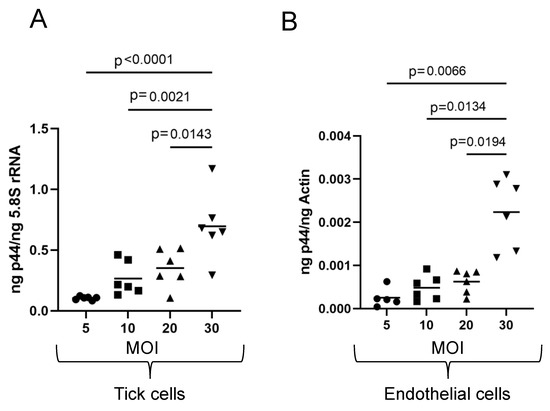 Quantitative measurement of bacterial loads in tick and endothelial cells upon infection with A. phagocytophilum at different MOIs determined by the McFarland standard. QRT-PCR analysis showing the levels of A. phagocytophilum in tick (A) or endothelial (B) cells upon infection at different MOIs (5, 10, 20, and 30) is shown. Bacterial levels (A. phagocytophilum p44 gene) were normalized to host 5.8S rRNA levels or host beta-actin levels in DNA samples. Statistical analysis was performed with one-way ANOVA or ANOVA with Welch correction. Horizontal lines indicate mean. p < 0.05 is considered significant.