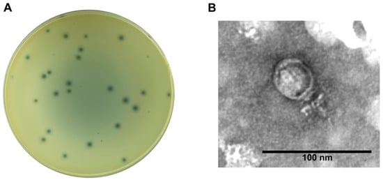 The lytic Staphylococcus phage CapO46, hereafter referred to as CapO46, was isolated from goat farm (caprinocultura in Brazilian Portuguese) wastewater using an S. aureus strain (O46) obtained from an ewe with mild mastitis [,]. The phage readily achieves high titers (>1010 PFU/mL) when routinely propagated in its isolation host. In the BHI medium, the phage produces clear, round lysis plaques approximately 1 mm in diameter, surrounded by a translucent halo of about 3 mm in diameter (Figure 1A). Electron micrographs reveal that the phage has a podovirus morphology, with an icosahedral head approximately 40 nm in diameter (n = 3) and a short, non-contractile tail about 23 nm in length (Figure 1B).