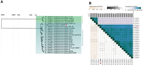 CapO46 phage (A) Phylogenetic tree and (B) Intergenomic similarity scores, showing its relationship with RefSeq genomes of members of the Rakietenvirinae subfamily. The CapO46 phage is highlighted with a red star in both images.