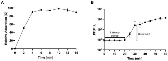 The adsorption assay was conducted as described by Hyman and Abedon [] but with modifications. The bacterial culture was infected with the phage at a multiplicity of infection (MOI) of 0.01 and incubated at 37 °C for 14 min. Samples were collected immediately and at 2 min intervals, post-infection, then centrifuged at 13,000× g for 1 min. The supernatants were diluted and plated using the double-layer agar (DLA) method to determine the titers of non-adsorbed phages. The adsorption curve was expressed as relative adsorption (%), calculated as follows: