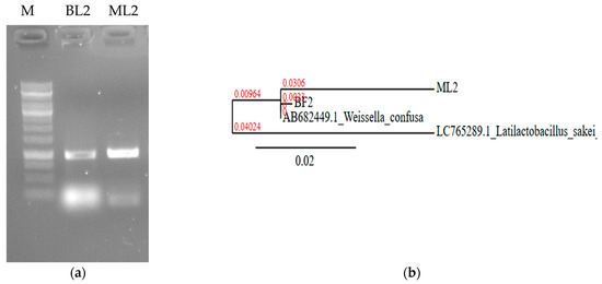 Nucleic acid-based identification of BL2 and ML2 isolates. (a) Sequence amplification with 16S rRNA specific primers. M: 1 kb DNA marker. (b) Neighbor-joining phylogenetic tree based on 16S rDNA sequence showing the relationship with Weissella confusa NBRC 106469 gene:AB682449.1. Latilactobacillus sakei LC765289.1 was used as an outgroup. The scale bar indicates the evolutionary distance, and the number along the tree branch indicates the bootstrap value.