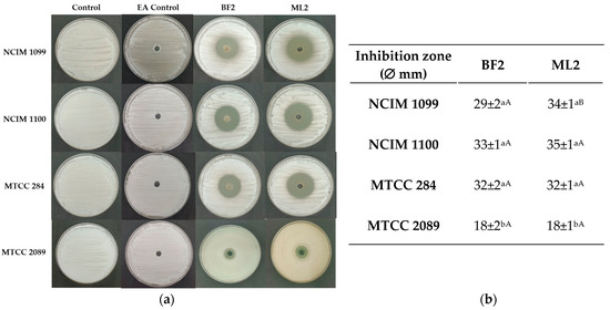 Diffusion test. (a) Antifungal activity of ethyl acetate extracts of CFCS of Weissella confusa BF2 and ML2 against Fusarium verticillioides NCIM 1099 and NCIM 1100, F. oxysporum MTCC 284, and F. graminearum MTCC 2089 strains. EA: ethyl acetate. (b) The average diameters of the inhibition zones, along with their standard deviations, are presented (n = 3). Statistically significant differences (p < 0.05) are indicated by different letters. Lowercase letters denote differences in inhibition zones produced by varying concentrations of the same strain’s cell-free culture supernatant (CFCS) extract. Uppercase letters signify differences in inhibition zones produced by different strain extracts on the same fungal strain.