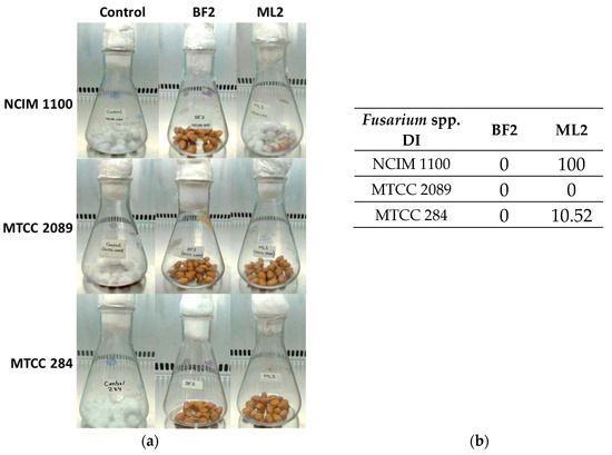 Biocontrol efficacy experiments with peanuts revealed that W. confusa ML2 has limited antifungal activity against F. verticillioides NCIM 1100 (Figure 5a), while applying BF2 in peanut treatment was successful against all three Fusarium species. The disease incidence (DI), which for the controls was 100%, was zero for all of the BF2 isolate treatments, while for the ML2 strain, it was 100% with NCIM 1100, 10.52% with MTCC 284, and zero with MTCC 2089 (Figure 5b).