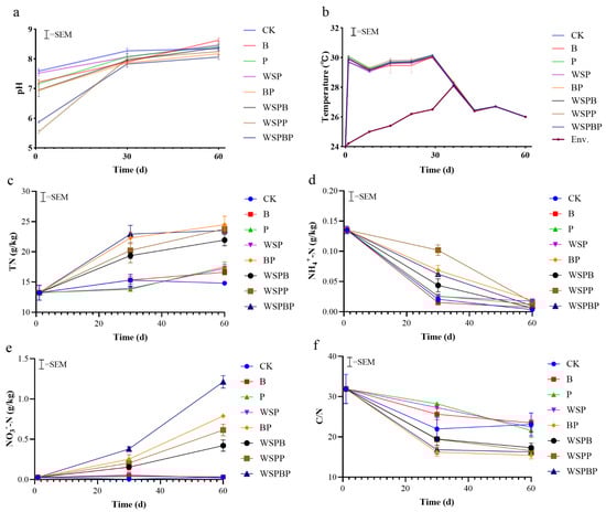 Different from TN, the variation in -N is shown in Figure 1d, and it showed a decreasing trend in all treatment groups. On day 30, the highest -N content was found in WSPP (10.20 ± 5.51 g/kg) and the lowest was in B (1.47 ± 1.00 g/kg). On day 60, all the treatment groups stabilized, and the lowest -N content was in CK (0.3 ± 0.05 g/kg).