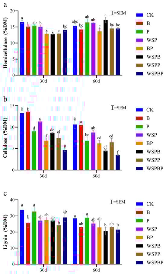 Lignocellulose consists of polysaccharides (cellulose, hemicellulose, pectin) with the aromatic polymer lignin. Cellulose, hemicellulose, and lignin represent the primary carbon-containing constituents within biomass, and the interactions between these components can significantly affect the degradation process [23]. Lignin is the most difficult part of agricultural production waste to degrade, so the effective degradation of lignin can achieve ideal results. The changes in the content of cellulose, hemicellulose, and lignin are shown in Figure 2. Overall, for cellulose, hemicellulose, and lignin in the moldy silage and rape straw, their degradation was improved differently by the addition of bacterial agents. As far as hemicellulose is concerned, BP, WSPB, and WSPP had better degradation on day 30, which was 3.72% less than CK, but it was not significant on day 60 for all treatment groups (Figure 2a). As for cellulose, the best degradation was observed for WSPBP, which was 8.57% less than that of CK on day 30, and the same was observed on day 60. However, WSPB and WSPP also ended up with better degradation, at 6.09% and 4.16% less than CK (Figure 2b). In the case of lignin, the most significant reduction was observed in the WSPP group on day 30 (9.57% lower than CK). By day 60, however, the WSPB group surpassed the other treatments with a 7.90% reduction compared to CK, while WSPP retained a moderate reduction of 4.48% (Figure 2c).