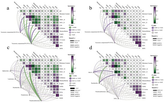 Redundancy analysis (RDA) and Spearman’s correlation analysis can visualize the correlation between microbial communities and environmental factors as well as better understand the changes in compost properties with different treatment groups. The results of the RDA showed that the correlation between environmental factors and bacterial and fungal communities varied greatly among the different treatments (Figure 6 and Figure S4). Interestingly, on day 30, WSPP behaved quite differently from the other treatment groups in that its bacterial community was positively correlated with TN and -N, whereas it was negatively correlated with mycotoxins, hemicellulose, and cellulose as well as its fungal community (Figure 6a,b and Figure S4a,b). Different from day 30, the bacterial community in WSPP was negatively correlated with a large proportion of mycotoxins on day 60. However, the fungal community in WSPP was negatively correlated with both insoluble fiber and mycotoxins (Figure 6c,d and Figure S4c,d). The results showed that the microbial communities inoculated with different bacterial agents produced different effects on environmental factors. Notably, inoculation with Weissella paramesenteroides and Paenibacillus sp. in the microbial communities contributed to an increased nitrogen content and reduced mycotoxins. Bacteria of the genus Paenibacillus sp. have also been identified as strains with the potential to biodegrade lignocellulose through the secretion of enzymes such as amylases, cellulases, hemicellulases, lipases, and other ligninolytic enzymes, and they show high humification indices, and high activities of cellulase, beta-glucosidase, and alkaline phospho-monoesterase were also achieved [25].