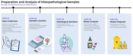 (d) Step 4—The 8 slides prepared from each patient were examined by the techniques of hematoxylin–eosin and immunohistochemistry for ZIKV and CHIKV, one of which was kept in reserve, in case the experiment needed to be repeated.