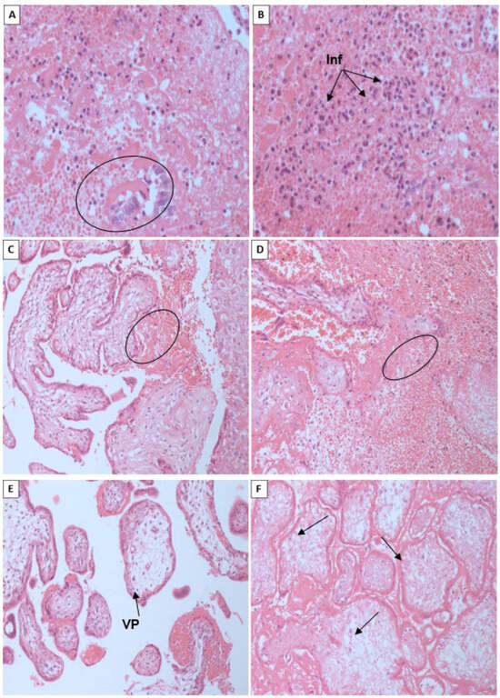 Histopathological analysis of fetal material and gestational tissues from the product of abortion: (A) Arias-Stella phenomenon (AS) highlighted within the circles; (B) Inflammatory infiltrate (Inf) of mononuclear lymphocytes, plasma cells and neutrophils, identified by arrows; (C,D) Hemorrhage demarcated within the circles; (E) Placental villi (PV) showing a delicate swollen conjunctival mesh, indicated by the arrow; (F) Tissue necrosis demonstrated by the arrow. Staining: Hematoxylin-eosin. Magnification 400×. Source: Research protocol, 2022.