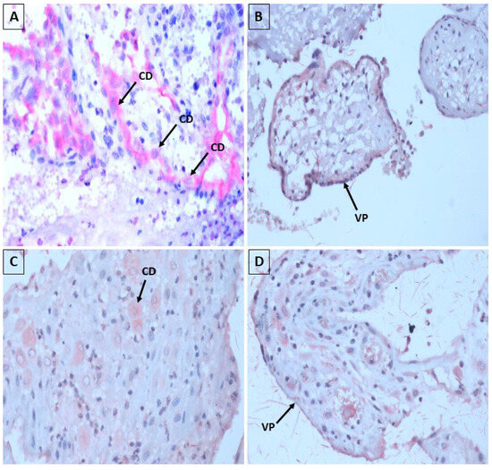 Using immunohistochemical techniques, the CHIKV antigen was detected in the epithelial cells of the endometrial glands and in the decidual cells, in the case of spontaneous abortion. In addition, CHIKV antigen was also detected in some chorionic villus STB. Likewise, our findings corroborate those of the aforementioned author [56].