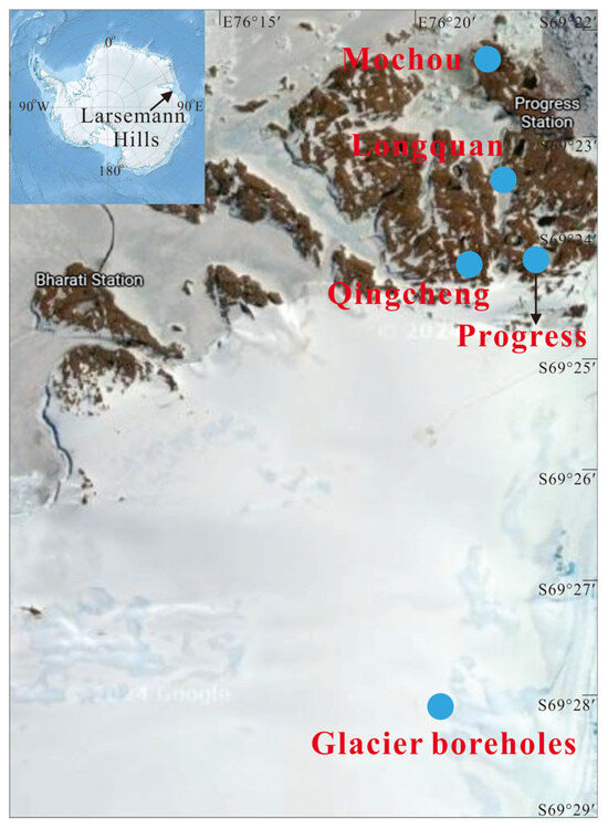 The Larsemann Hills, located on the east coast of Antarctica, are recognized as the second largest ice—free oasis in the region [37]. This unique area contains two significant peninsulas: the Broknes Peninsula to the east and the Stones Peninsula to the west. Within this oasis, there are approximately 150 freshwater lakes [38,39], which present a diverse range of sizes and ecological characteristics. These lakes can be categorized as either seasonal or perennial. Specifically, some of these lakes experience brief periods without ice cover, while others remain ice—free during the summer months from December to February. During the summer, temperatures in these lakes can rise to around 8 °C [40,41].