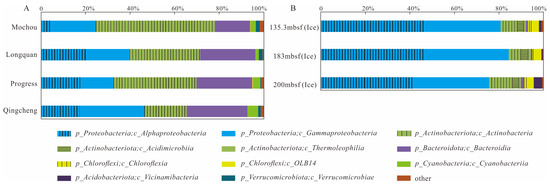 Relative abundance of major bacterial groups (>1%, at the class level) in the seven samples from the lakes and glacier borehole meltwater. (A) Total of bacterial groups; (B) composition of bacterial groups.