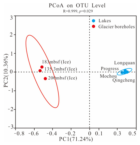 The PCoA plot showing the difference in bacterial community structure among the seven samples from the lakes and glacier borehole meltwater using the Bray—Curtis distance based on the OTU level. Ellipses represent 95% confidence intervals.