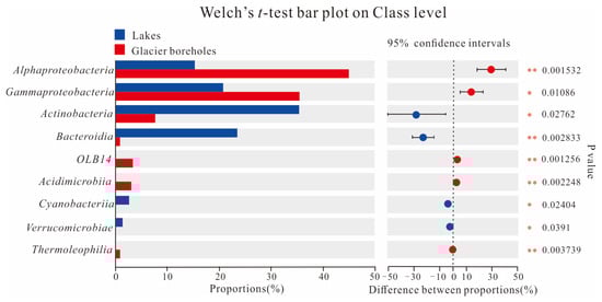 Welch’s t—test showing significant differences in the bacterial communities at class level among the samples from the lake and glacier borehole meltwater. Statistical significance indicates by asterisks: * 0.01 < p value ≤ 0.05; ** 0.001 < p value ≤ 0.01).