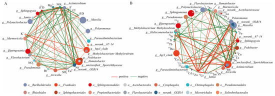 Spearman’s correlation analysis between the genera bacterial groups and environmental factors of the lake and borehole samples. A connection stands for a strong (Spearman’s |r|> 0.6) and significant (p < 0.05) correlation. Red and green edges indicate positive and negative correlations, respectively. (A) Major nutrients. (B) Dissolved trace elements.