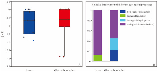 Assembly of the bacterial communities of the lake and glacier borehole meltwater. (A) Distribution of β nearest taxon index (βNTI) among different samples. Blue-colored and Red-colored symbols indicate the lake and glacier borehole meltwater samples, respectively. (B) Contributions of ecological processes to microbial bacterial assembly.