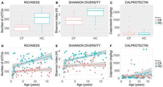 Alpha diversity indices and fecal calprotectin for cross-sectional comparison of children with cystic fibrosis versus healthy controls. Boxplots depict microbial richness (number of zOTUs)) (A), Shannon diversity (Shannon Index (H units)) (B), and the concentration of fecal calprotectin (mg/kg) (C) in fecal samples of the cystic fibrosis and healthy control cohorts. The central boxplot line indicates the median of the focus group, with the top and bottom values indicating the 1st and 3rd quartile. Scatterplots illustrate sample microbial richness (D), Shannon diversity (E), and fecal calprotectin (F) in the cystic fibrosis and healthy control cohorts with respect to age (years). Coloured lines indicate the cohort means, while shaded regions indicate 95% confidence intervals constructed from generalised linear models (D–F). CF = cystic fibrosis, HC = healthy controls, zOTU = zero-distance operation taxonomic unit, calprotectin = a measure of intestinal inflammation.
