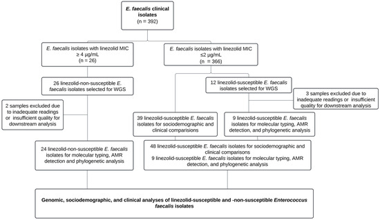 Finally, 48 linezolid-susceptible isolates were documented from clinical records (including the 12 previously described isolates that underwent WGS) for sociodemographic and clinical comparisons. The study workflow, which encompassed whole-genome sequencing, antimicrobial resistance characterization, and the sociodemographic and clinical profiling of patients with linezolid-susceptible and -non-susceptible Enterococcus faecalis isolates, is depicted in Figure 1.