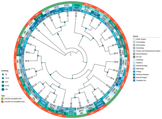 Molecular typing was performed using multilocus sequence typing (MLST) via the PubMLST database (https://pubmlst.org/organisms/enterococcus-faecalis, accessed on 22 January 2025), classifying isolates into sequence types (STs) based on the allelic profiles of seven housekeeping genes (gdh, gyd, pstS, gki, aroE, xpt, and yqiL).