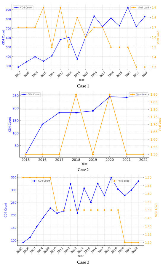 In our study, Cases 2 and 3 survived for at least five years with a CD4 cell count < 200 cells/mL. A systematic review revealed average rates of relapse for patients not receiving secondary prophylaxis of 67% vs. 31% for those receiving prophylaxis [25]. Therefore, the correct and systematic administration of secondary prophylaxis was most probably involved in the absence of relapse after so many years of follow-up.
