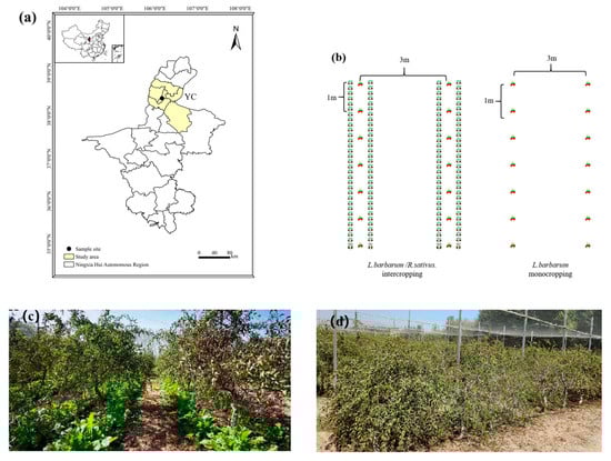 Experimental site and cropping systems. (a) Location of the experimental site in Yinchuan (YC), (b) schemes of two cropping systems, (c) cover cropping with R. sativus, and (d) monocropping of L. barbarum.