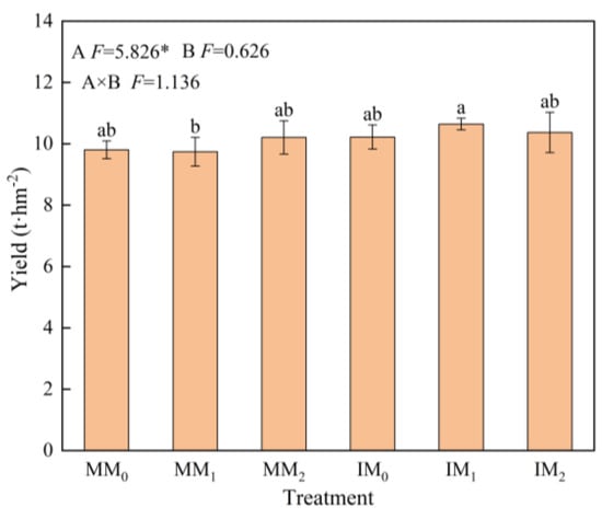 Fruit yield of Lycium barbarum under various treatments. Error bars represent the standard deviation of the mean (n = 3). Different letters above the error bars indicate significant difference among treatments (Duncan’s multiple range test: p < 0.05). MM0, MM1, and MM2 are the monocropping treatments and IM0, IM1, and IM2 are the cover cropping treatments, with zero, medium, and high levels of organic manure, respectively (* p < 0.05).