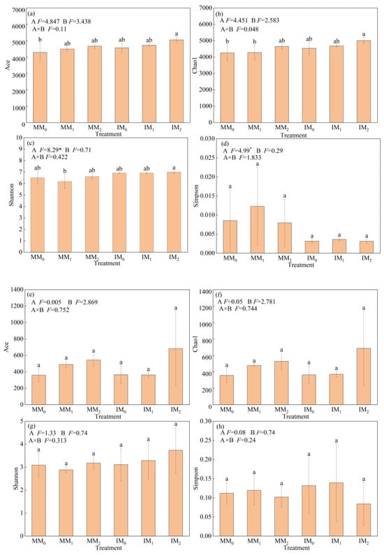 With respect to microbial alpha-diversity, Ace and Chao1 were used to measure species richness; the Shannon and Simpson indices were used to measure community diversity. The alpha-diversity indices of soil bacterial and fungal communities showed differential responses to various treatments (Figure 3). Compared to monocropping, the Ace, Chao1, and Shannon indices of bacterial communities increased by 6.32–6.57%, whereas the Simpson index decreased by 62.3% under cover cropping (Figure 3a–d). However, there were no significant differences in fungal alpha-diversity indices between the two cropping systems (Figure 3e–h). Under the same manure level, bacterial alpha-diversity indices were all higher in the IM2 treatment relative to the MM2 treatment, albeit not significantly. The Shannon index of bacterial communities was slightly higher in the IM1 treatment compared to the MM1 treatment, and the opposite trend was observed for the other three indices.