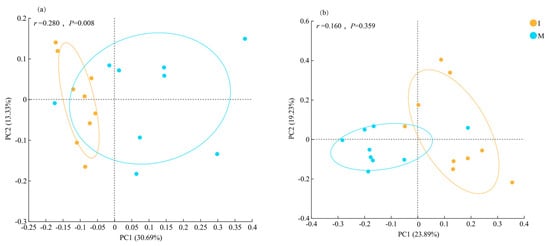 Beta-diversity of soil (a) bacterial and (b) fungal communities (operational taxonomic unit level) under monocropping (M) and cover cropping (I) revealed by principal co-ordinates analysis based on Bray–Curtis dissimilarity.