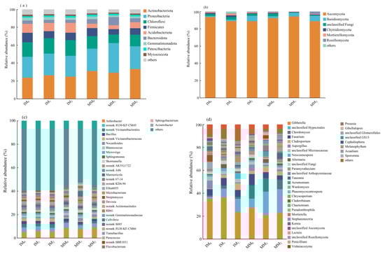 Relative abundance of major phyla (top panel) and genera (bottom panel) in soil (a,c) bacterial and (b,d) fungal communities under various treatments.