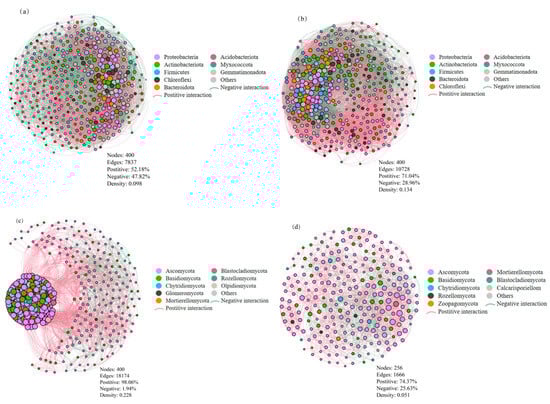 Co-occurrence networks of soil bacterial (top panel) and fungal (bottom panel) taxa under cover cropping (a,c) and monocropping (b,d) systems. Each node represents a phylum with an average relative abundance > 0.5%. The size of nodes is proportional to the number of connected edges, and the width of edges is proportional to Spearman’s correlation coefficient.