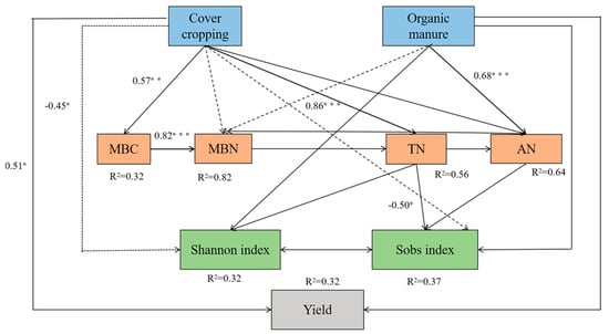 Structural equation modeling reveals the influence of cover cropping and manure application on soil properties, microbial diversity, and L. barbarum yield. MBC and MBN represent microbial biomass carbon and nitrogen, respectively; TN and AN represent total and available nitrogen, respectively. Positive and negative correlations are represented by solid and dotted arrows, respectively. Significant standardized path coefficients are shown on the arrows. * p < 0.05, ** p < 0.01, and *** p < 0.001.