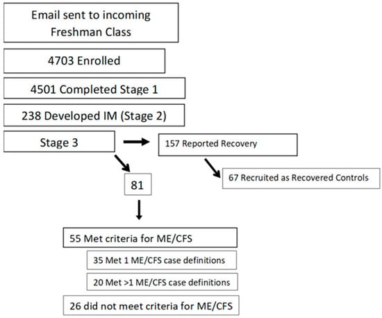 - Jason, L.A.; Cotler, J.; Islam, M.; Sunnquist, M.; Katz, B.Z. Risks for developing ME/CFS in college students following Infectious Mononucleosis: A prospective cohort study. Clin. Infect. Dis. 2021, 73, e3740–e3746. [Google Scholar] [CrossRef]