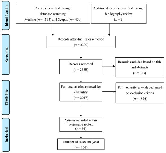 This study is registered with the Research Registry, and the unique identifying number is registry1947. A total of 1878 original articles from Medline and 450 articles from Scopus were identified that mention MeSH terms “pericarditis OR myopericarditis OR pericardium OR pancarditis” AND “fungal OR fungus OR fungi OR candida OR aspergillus OR aspergillosis OR histoplasma OR histoplasmosis OR blastomyces OR blastomycosis OR coccidioidomycosis OR paracoccidioidomycosis OR basidiobolomycosis OR cryptococcus OR cryptococcal OR mucormycosis OR sporothrix”. We excluded cases where the diagnosis was uncertain either because pericardiocentesis, pericardial biopsy, or autopsy was not performed, or pericardial fluid was sterile. We also excluded duplicate articles, articles in languages other than English, abstracts without comprehensive case descriptions, and narrative reviews. Ultimately, our review included 101 cases that fulfilled the criteria. Figure 1 shows the detailed process of article selection and the final cases included in the analysis.