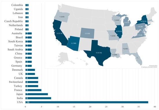 Our review identified 101 unique patients that fulfilled the inclusion criteria from 91 case reports describing a single patient and 5 case series that described two patients each [12,13,20,21,22,23,24,25,26,27,28,29,30,31,32,33,34,35,36,37,38,39,40,41,42,43,44,45,46,47,48,49,50,51,52,53,54,55,56,57,58,59,60,61,62,63,64,65,66,67,68,69,70,71,72,73,74,75,76,77,78,79,80,81,82,83,84,85,86,87,88,89,90,91,92,93,94,95,96,97,98,99,100,101,102,103,104,105,106,107,108,109,110,111,112]. A total of 12 cases were pediatric (0 to 18 years) and 89 were adults (18 and older) with an adult mean age of 50.3 ± 16.7 years, with that for pediatrics being 5.8 ± 5.5 years. Most patients were male (n = 68, 67.3%) and no statistical differences were seen in sex-related survival (p = 0.337 for adults; p = 0.224 for the pediatric population). By region, North America reported the most cases (n = 42, 41.6%), of which the USA had 38 cases (Figure 2).
