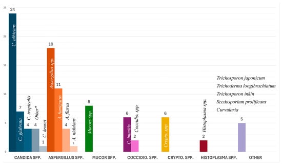 In adults, Candida spp. (n = 34, 38.2%) were the most common fungal isolate with C. albicans as the dominant species (n = 20, 22.5%). In pediatric cases, Aspergillus spp. (n = 7, 58.3%) were the most common fungal isolate, followed by Candida spp. (n = 4, 33.3%). Two cases reported a co-infection, one with C. albicans and C. galbrata, and another with C. albicans and C. tropicalis. Infection with Aspergillus spp. and Mucor spp. was statistically associated with lower survival rates (p = 0.008). All isolated fungi are presented in Figure 3.
