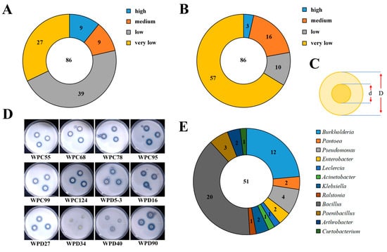 Preliminary screening and identification of PSBs. (A) Number of PSBs in liquid medium for soluble phosphorus content with different solubilization potential (high ≥ 13 mg/L; 10 mg/L ≤ medium < 13 mg/L; 7 mg/L ≤ low < 10 mg/L; very low < 7 mg/L). (B) Number of PSBs in solid medium for phosphate solubilization index with different solubilization potential (high: D/d ≥ 3; medium: 2 ≤ D/d < 3; low: 1.5 ≤ D/d < 2; very low: D/d < 1.5). (C) Phosphate solubilization index (D/d) pattern (halo zone diameter/strain diameter). (D) Pictures of some halo zone of PSBs. (E) Number of PSBs in each genus after rescreening.