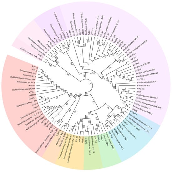 For the 51 strains of PSBs, after rescreening, 16SrRNA sequence analysis was performed. The DNA of the test strains was extracted using a bacterial genomic DNA extraction kit(CW0552S, CWBIO, Jiangsu, China) and amplified by PCR(T30, LongGene, Hangzhou, China) using bacterial universal primers, 27F and 1492R [24]. The PCR reaction system comprises the following components: genomic DNA (0.5 μL), 10 × Buffer with Mg2+ (2.5 μL), dNTP (1 μL), RNA polymerase (0.2 μL), 10 μmol/L upstream and downstream primers (0.5 μL each), and double-distilled water (25 μL). The PCR conditions are as follows: 94 °C pre-denaturation 45 s; 55 °C reversion 45 s; 72 °C extended 1 min, a total of 30 cycles; 72 °C repair extension 10 min; and terminate the reaction at 4 °C. The PCR amplification products were sent to Bioengineering (Shanghai) Co., Ltd., for sequencing. The sequencing results were compared on NCBI, and the phylogenetic tree was constructed using the software MEGA 11 [25].