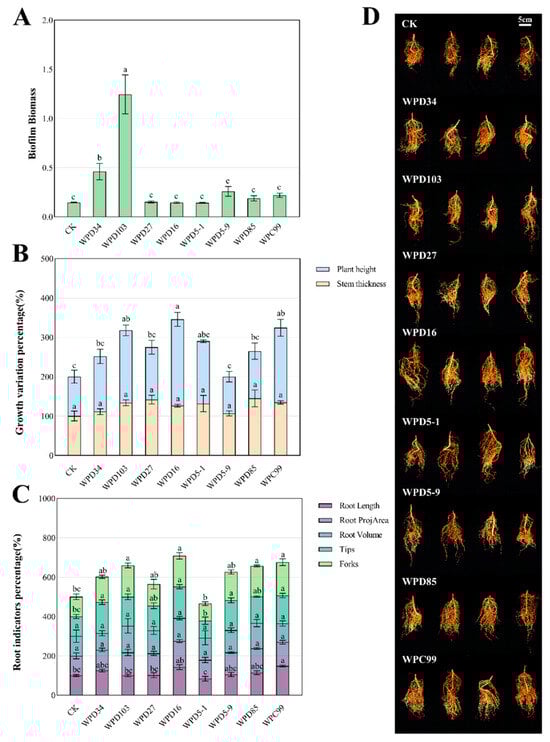 Biofilm formation capacity of eight dominant strains and potting experiment. (A) Biofilm formation capacity. (B) Percentage change in growth of peach seedlings. (C) Percentage of root system indexes (root length, root ProjArea, root volume, tips, and forks) in peach seedlings. (D) Picture of peach seedling root system after 40 days of treatment. Each experiment was performed with at least three biological replications. Different lowercase letters indicate significant differences between treatments (p < 0.05).