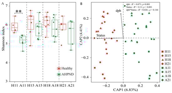 The diversity and structures of bacterial community in healthy and acute hepatopancreatic necrosis disease (AHPND)-infected postlarval shrimp. (A) Comparison of Shannon index between healthy and AHPND cohorts at each sampling using Wilcoxon rank-sum test. **: p < 0.01. (B) Constrained analysis of principal coordinates revealing the effects of days post hatching (dph) and AHPND on the larvae-associated microbiota. PERMANOVA evaluates the importance of dph and healthy status in shaping bacterial community structure. H: healthy shrimp; A: AHPND-infected shrimp. Numbers are dph. dph*status indicates the interactive effect of dph and shrimp health status on the variance in postlarval shrimp-associated microbiota.