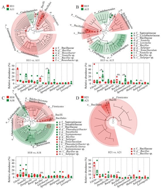 The differential taxa and relative abundance of the 10 most abundant genera between AHPND-infected larvae and matched healthy shrimp at (A) 11, (B) 15, (C) 18, and (D) 21 days post hatching using LEfSe analysis and unpaired t-test, respectively. **: p < 0.01 and *: p < 0.05. The circle diameter is proportional to the abundance of a bacterial taxon. Red and green indicate the differential taxa that are enriched in healthy and AHPND-infected larvae, respectively. Refer to Table 1 for abbreviations.