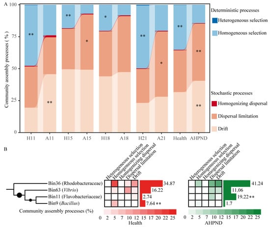 AHPND-induced shifts in microbial community assembly dynamics. (A) Contrasting assembly processes between shrimp health statuses at each sampling using Wilcoxon rank-sum test. *: p < 0.05; **: p < 0.01. (B) Phylogenetic bin-based null model analysis identifies the important bins triggering the ecological processes of bacterial communities. Relative abundances of the bins between healthy and AHPND cohorts are compared using Wilcoxon rank-sum test. **: p < 0.01. Refer to Table 1 for abbreviations.