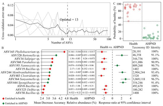 Identification of biomarkers for diagnosing AHPND infection. (A) The top 13 AHPND-discriminatory ASVs are ascertained by 10-fold cross-validation. (B) The importance scores of AHPND-discriminatory ASVs and their differences between larval shrimp health status using response ratio analysis at a 95% confidence interval. (C) The predicted and diagnosed health status with a cutoff of 50%.
